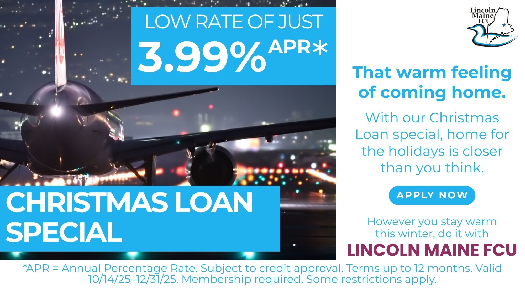 APR = Annual Percentage Rate. Subject to credit approval. Rate will be based on overall creditworthiness. Loan terms not to exceed 12 months. Standard 3.99% APR valid October 20–December 31, 2025. Rates are subject to change without notice. Ask about other terms and rates. Credit Union membership is required for loan disbursal. Some restrictions apply. Contact us for details: 207-794-8623.